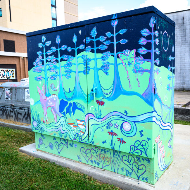 Seven new pieces of public art are on permanent display throughout the downtown area. Sponsored by the City of Bloomington Arts Commission, seven local artists painted new designs representing native Bloomington flowers, nature, and wildlife on traffic boxes located at several intersections.